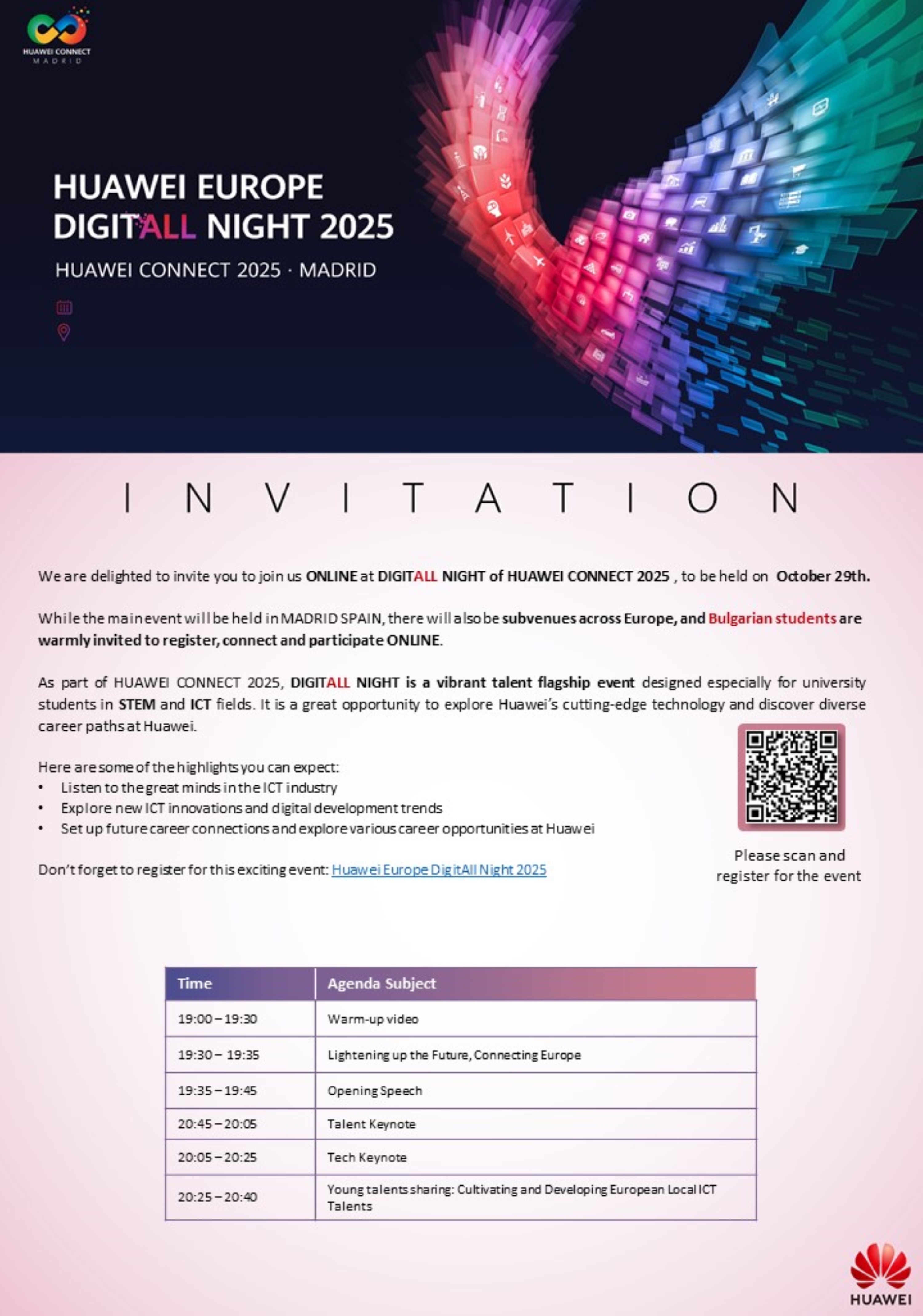 Huawei invites you to join the online edition of Europe Digital Night 2025 on October 29, 2025. You will have the opportunity to hear from some of the leaders in the ICT industry, who will share their views on innovations and trends in the development of digitalization.