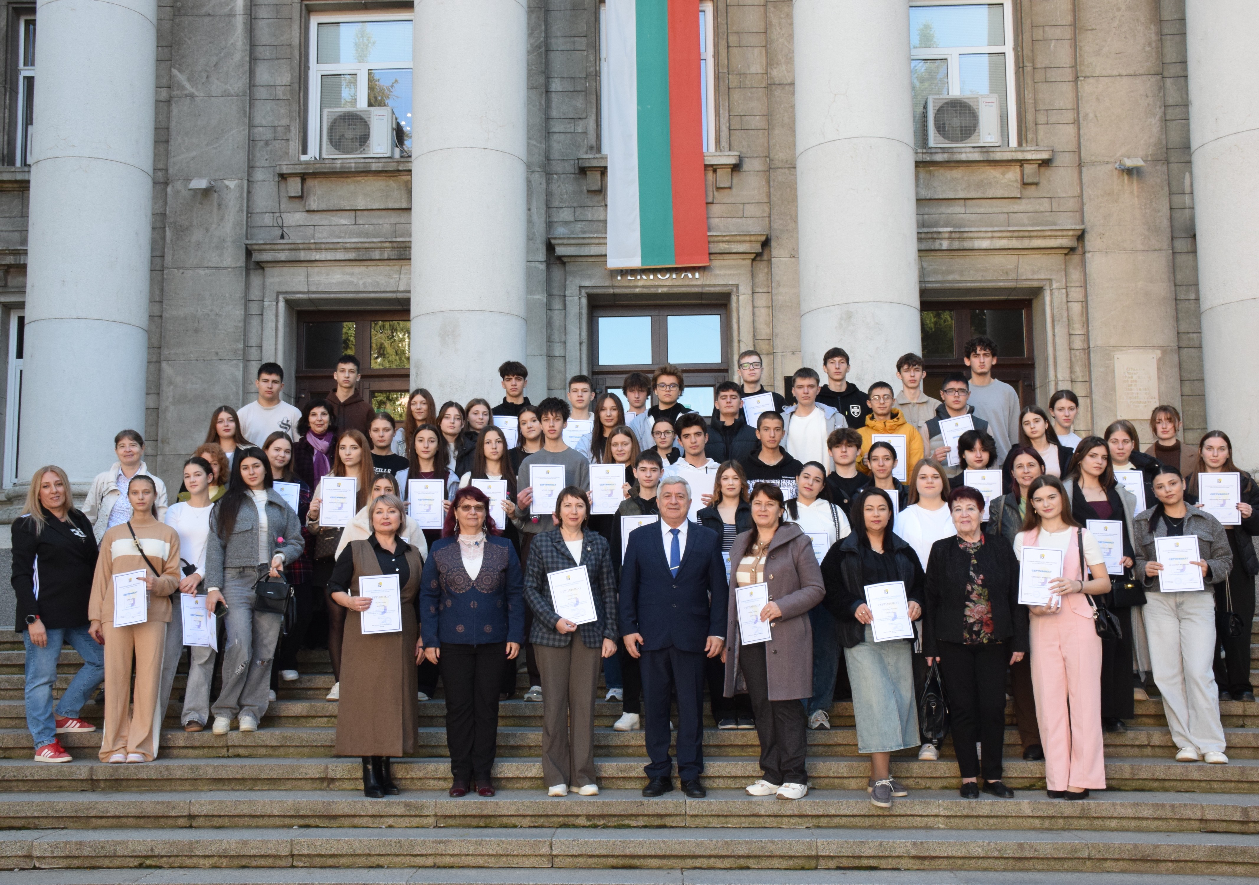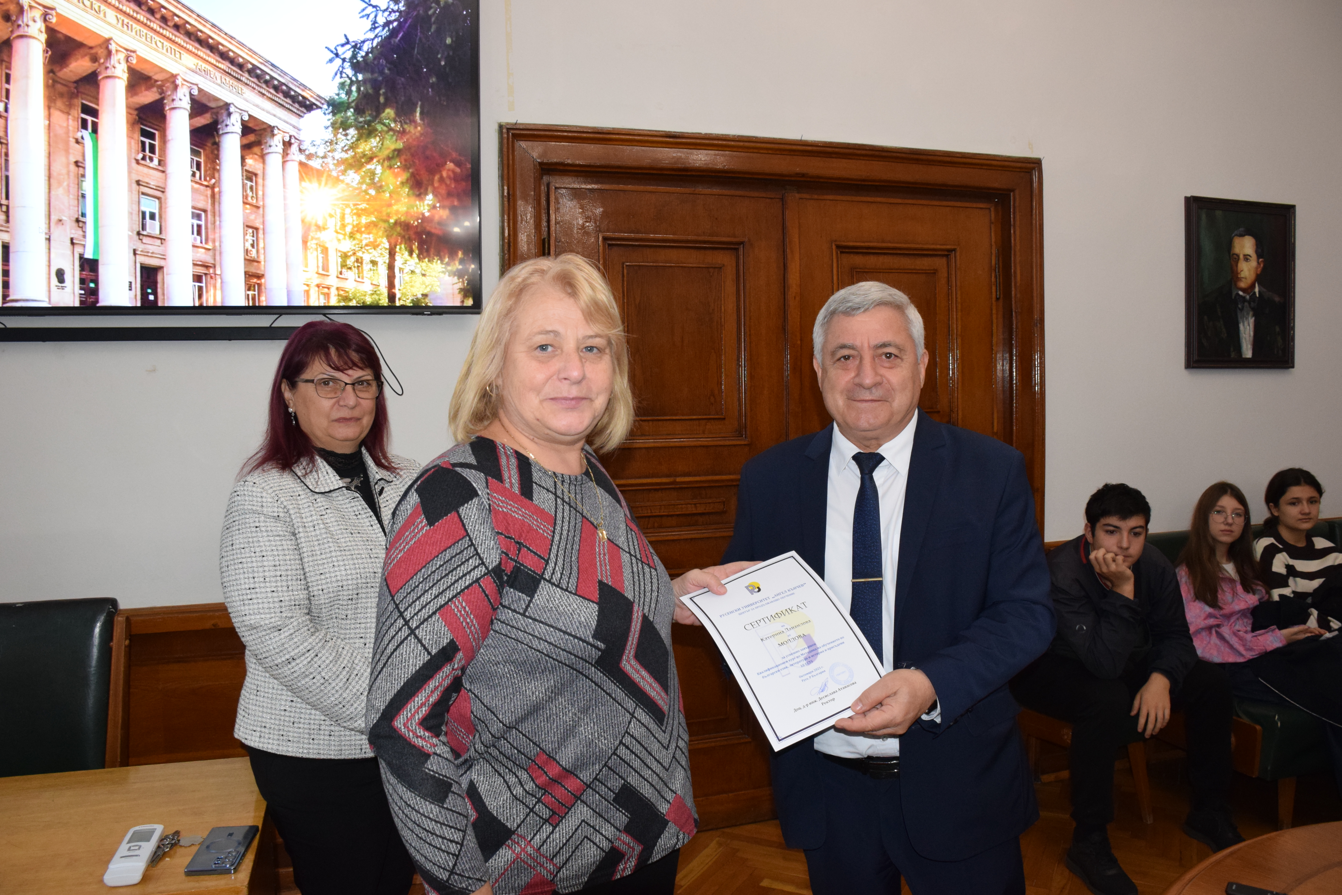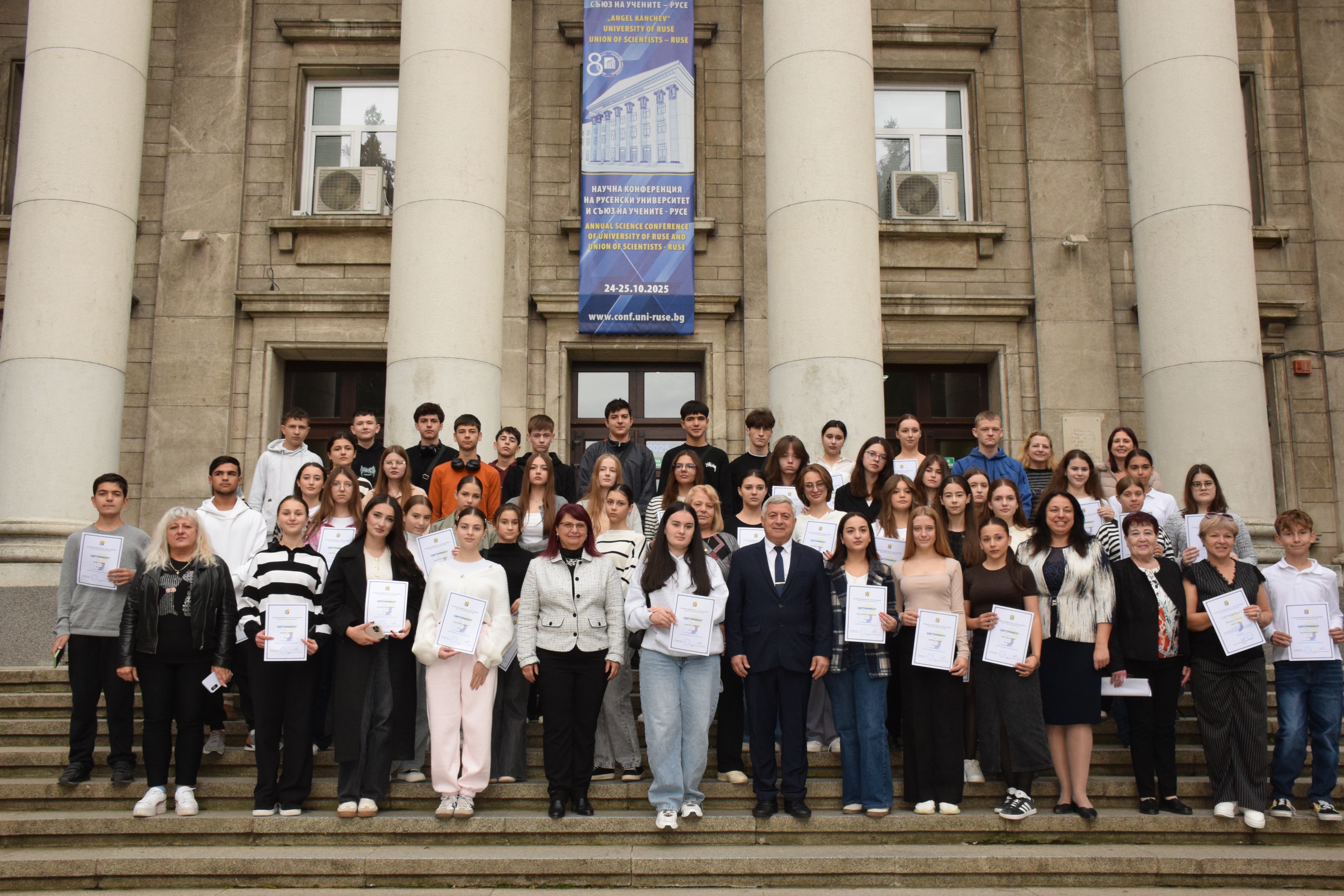 Today, October 24, 2025, in the conference hall of the Rectorate of the University of Ruse, 50 students and teachers from high schools and lyceums in Kirso, Chadyr-Lunga, Chadar-Lunga, and Comrat, Republic of Moldova, predominantly inhabited by Bulgarian communities, received certificates for completing a qualification course and linguistic practice in Bulgarian language and culture. The children and their teachers from Moldova studied at the University of Ruse.