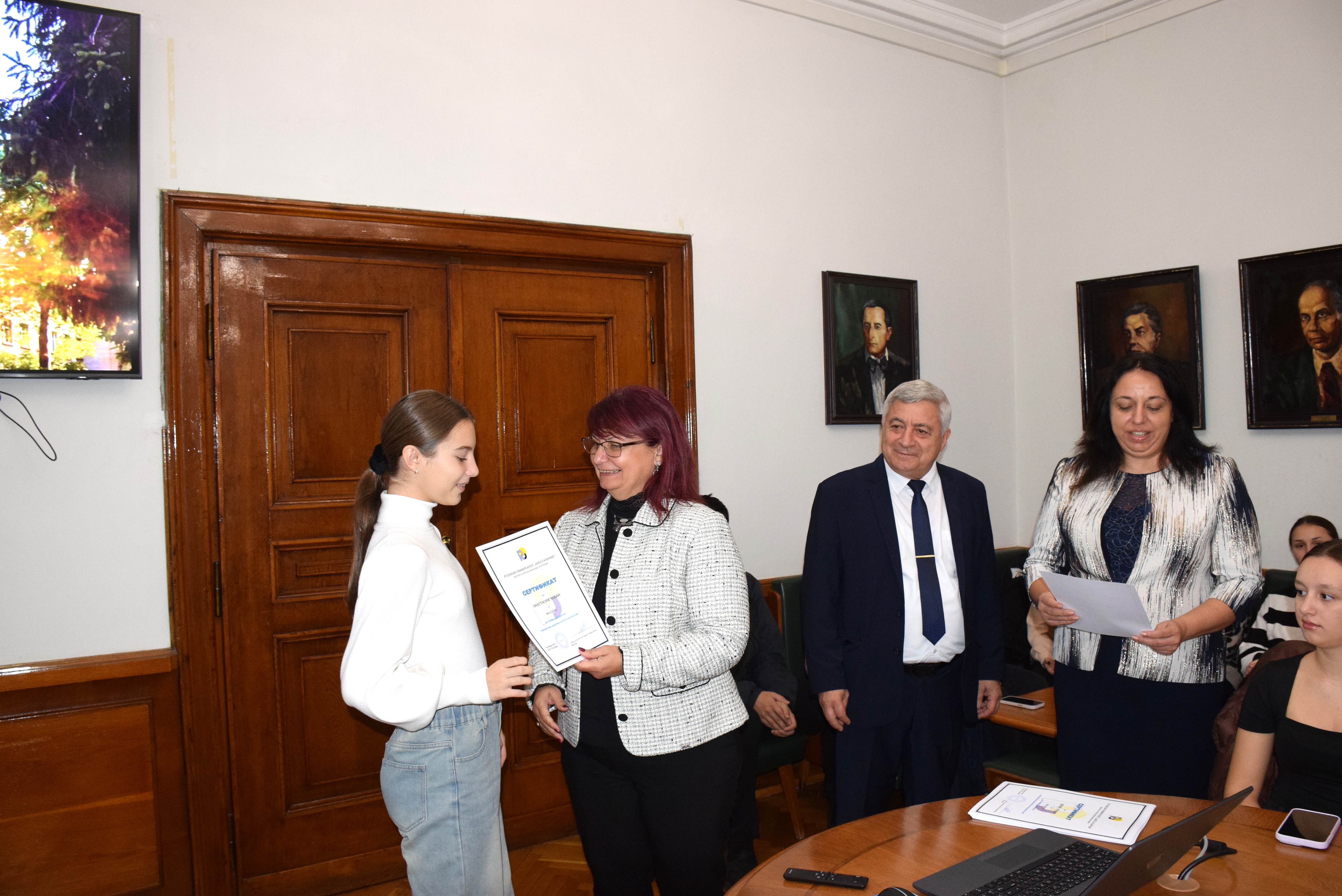 The certificates were presented to the teachers by Academician Hristo Beloe, DscEng - Honourary Rector and Chairman of the General Assembly of the University of Ruse, and the Rector of the University of Ruse, Associate Professor Desislava Atanasova, PhD handed out the certificates to the students. The event was attended by lecturers from the departments of "Bulgarian Language, Literature, History and Arts" and "Foreign Languages".