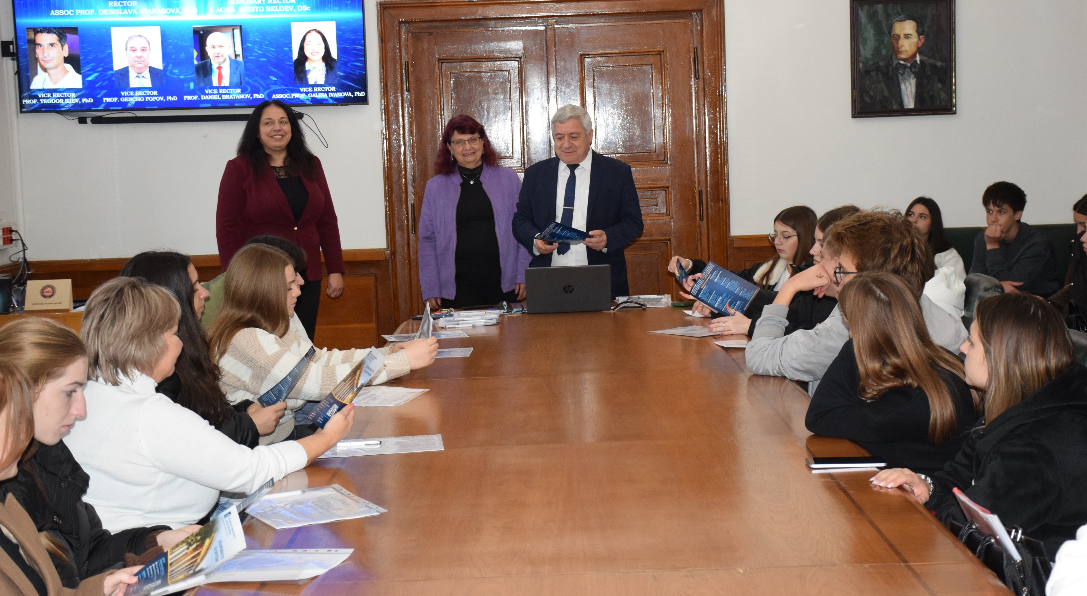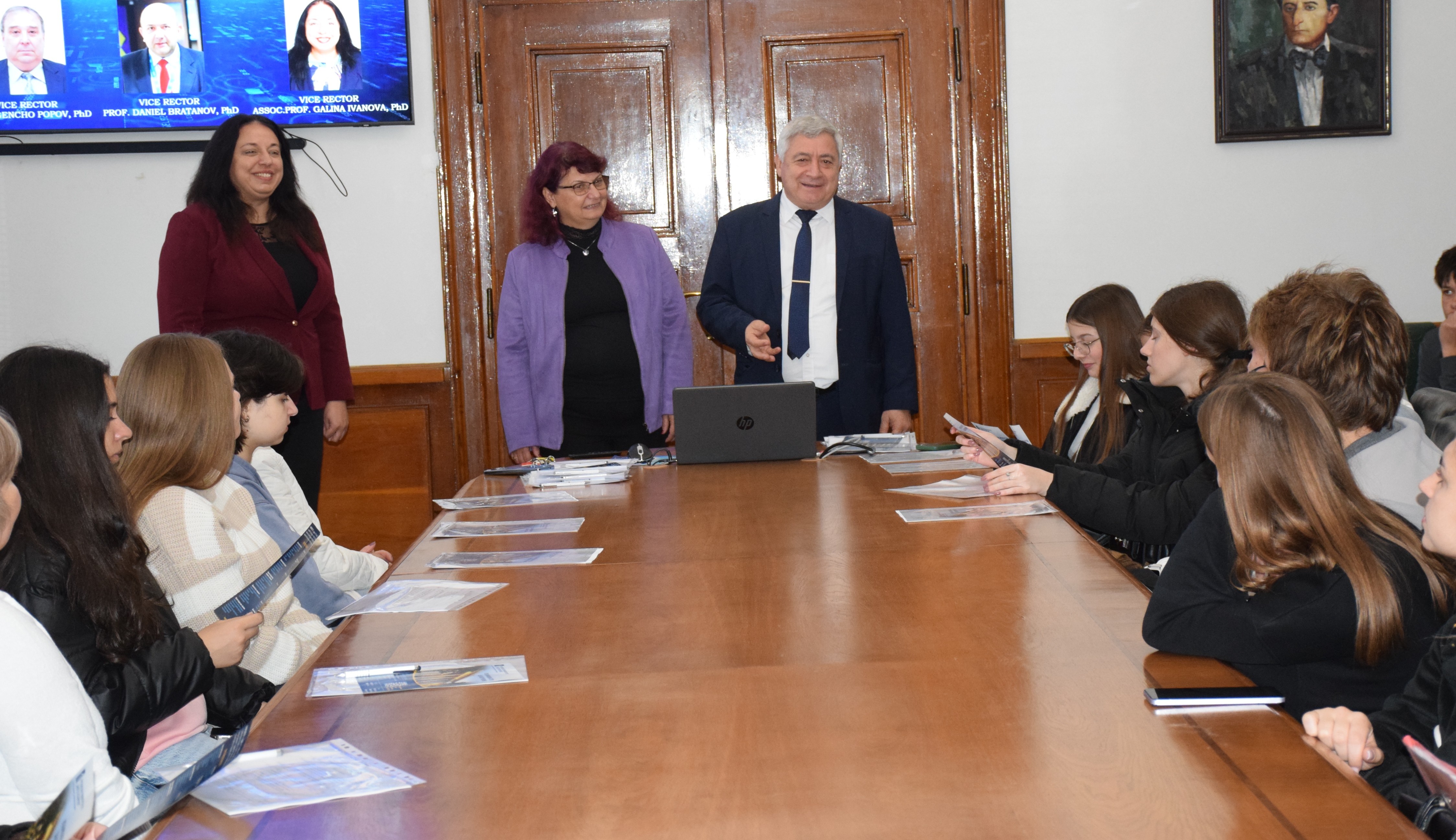 The group was welcomed in the Conference Hall of the Rectorate by the Rector of the University of Ruse, Assoc. Prof. Desislava Atanasova, PhD and Academician Hristo Beloev, DscEng - Honourary Rector and Chairman of the General Assembly of the University. They welcomed them with a "Welcome" to the University of Ruse and to the beautiful city of Ruse!