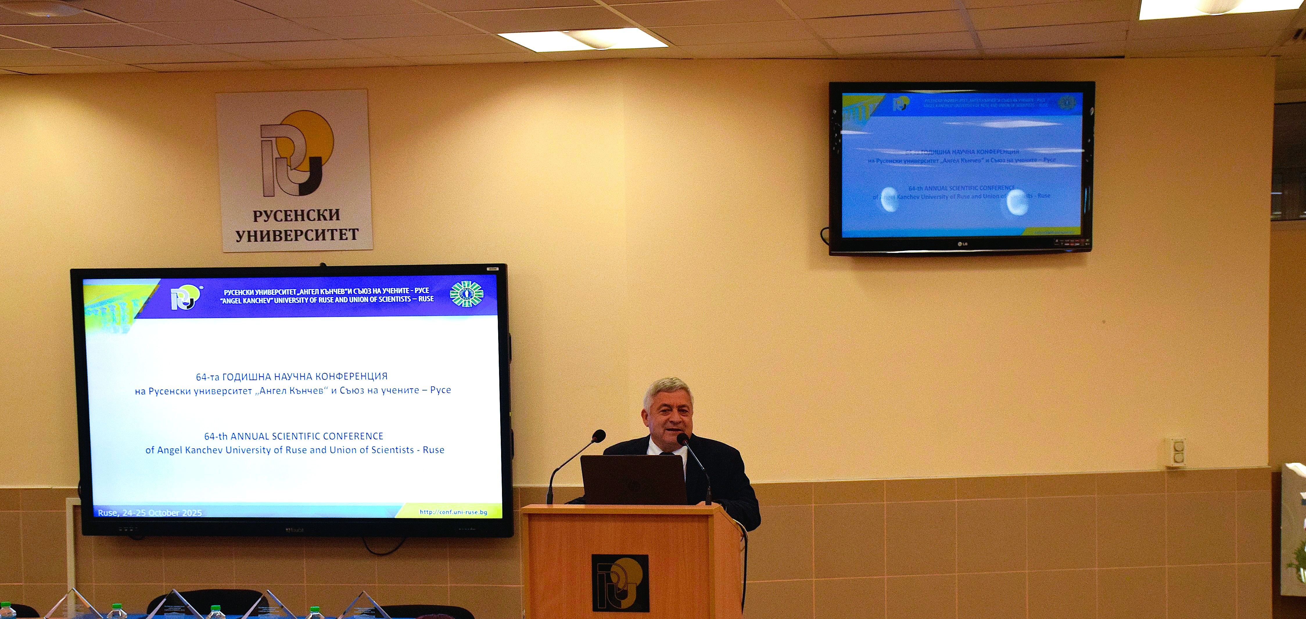 Today, October 24th, 2025, the sixty-fourth edition of the annual international scientific conference was held in the Siemens Hall of the University of Ruse. The event began with a plenary session opened by Assoc. Prof. Desislava Atanasova, PhD, Rector of the University of Ruse and Chair of the Union of Scientists - Ruse, and Acad. Hristo Beloev, DscEng, Honourary Rector and Chair of the University General Assembly.